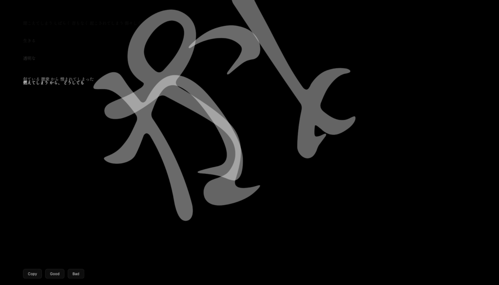 わたしのLLMを前にしてみると、画面にただ流れていく単語にはもちろん意味があるが、一見意味のなさそうな文章にも、どこか意味や風景を見出してしまうおうとする姿勢が、あなたの無意識の中に立ち現れる。